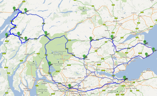Ennen kuin mennään matkakertomuksiin Skotlannista, ajattelin palata hetkeksi menneen matkan pääpiirteisiin. Piirsin ajoreitin kartalle helpottamaan hahmottamista, miltä kulmilta tulevat kuvat ja tunnelmat ovat. Matka-aikaa oli viikko, ja auton vuokrasin alle Edinburghista. Sieltä matka kaarsi Glasgown kautta Lock Lomondia sivuten ja järivalueita ihastellen, ylämaan rajaa tunnustellen, maan halki, valuen lopulta itäistä rannikkoa alas takaisin Edinburghiin.