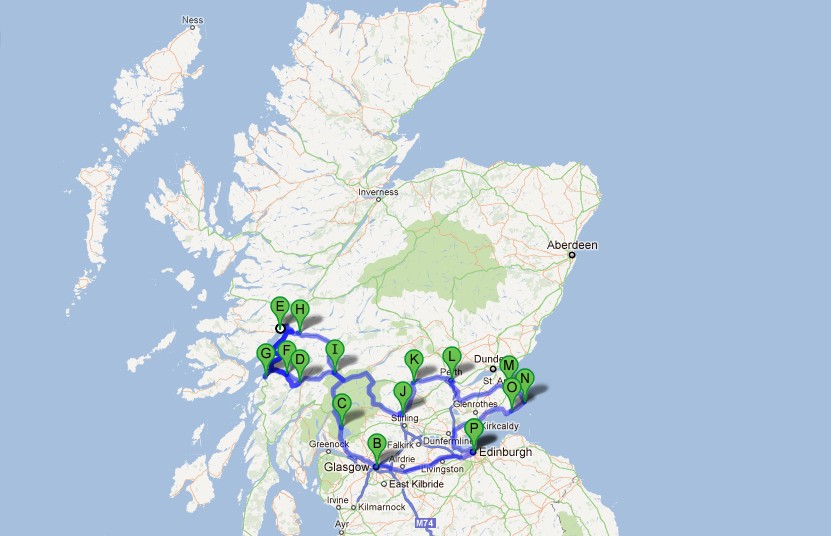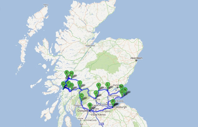 Ennen kuin mennään matkakertomuksiin Skotlannista, ajattelin palata hetkeksi menneen matkan pääpiirteisiin. Piirsin ajoreitin kartalle helpottamaan hahmottamista, miltä kulmilta tulevat kuvat ja tunnelmat ovat. Matka-aikaa oli viikko, ja auton vuokrasin alle Edinburghista. Sieltä matka kaarsi Glasgown kautta Lock Lomondia sivuten ja järivalueita ihastellen, ylämaan rajaa tunnustellen, maan halki, valuen lopulta itäistä rannikkoa alas takaisin Edinburghiin.