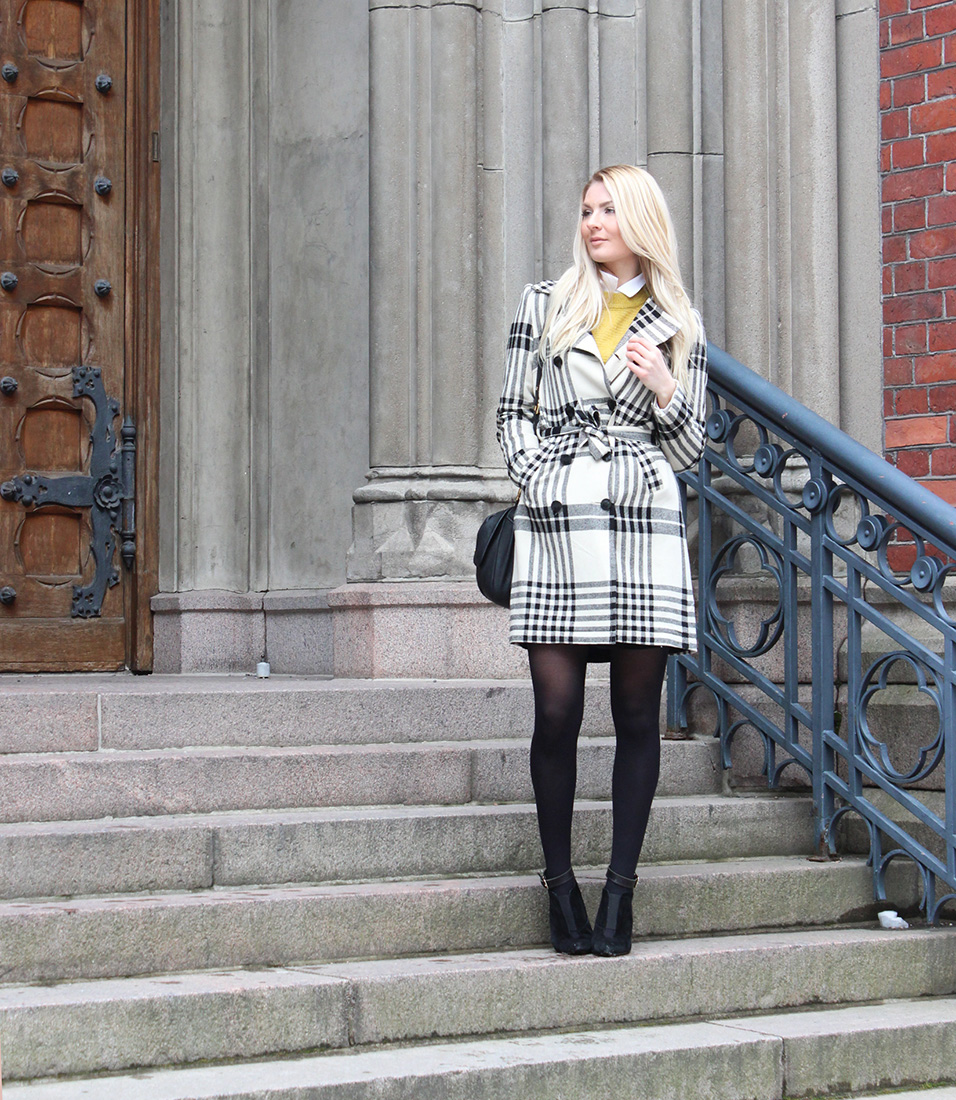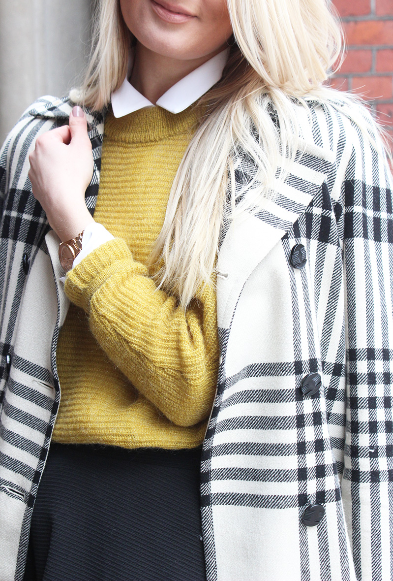 Neule: Lindex* / Takki, kauluspaita ja hame: H&M / Nilkkurit: Zign, Zalando* / Laukku: Marc Jacobs