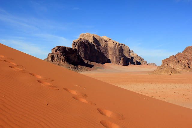 Kuulaaksoksikin kutsutun Wadi Rumin aavikkokaistaleen näkymä avautui jeepin lavalta uskomattoman upeana, hiiskumaton hiljaisuus ja tuulen mukaansa nostattama hieno hiekka ympäröivät. Jylhät kalliot loivat terävät varjot maisemaan ja jeeppi kierteli solia ja nyppylöitä, piirtäen verkkokalvoille toinen toistaan mielenkiintoisempia muotoja ja värejä.