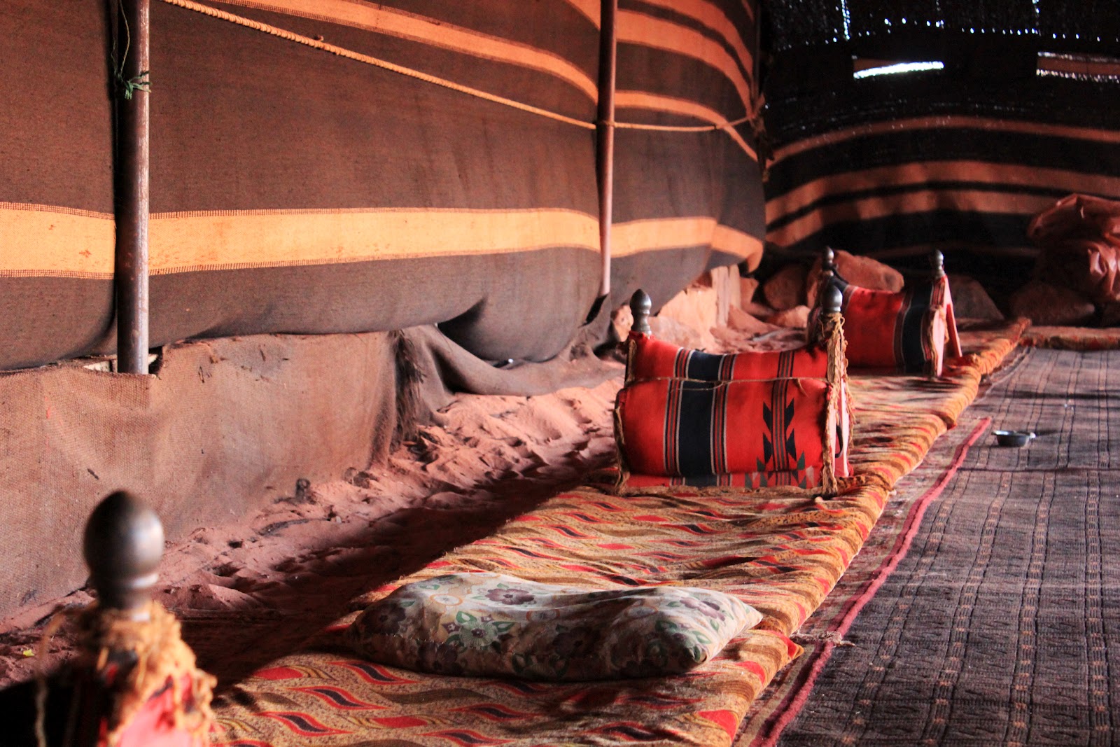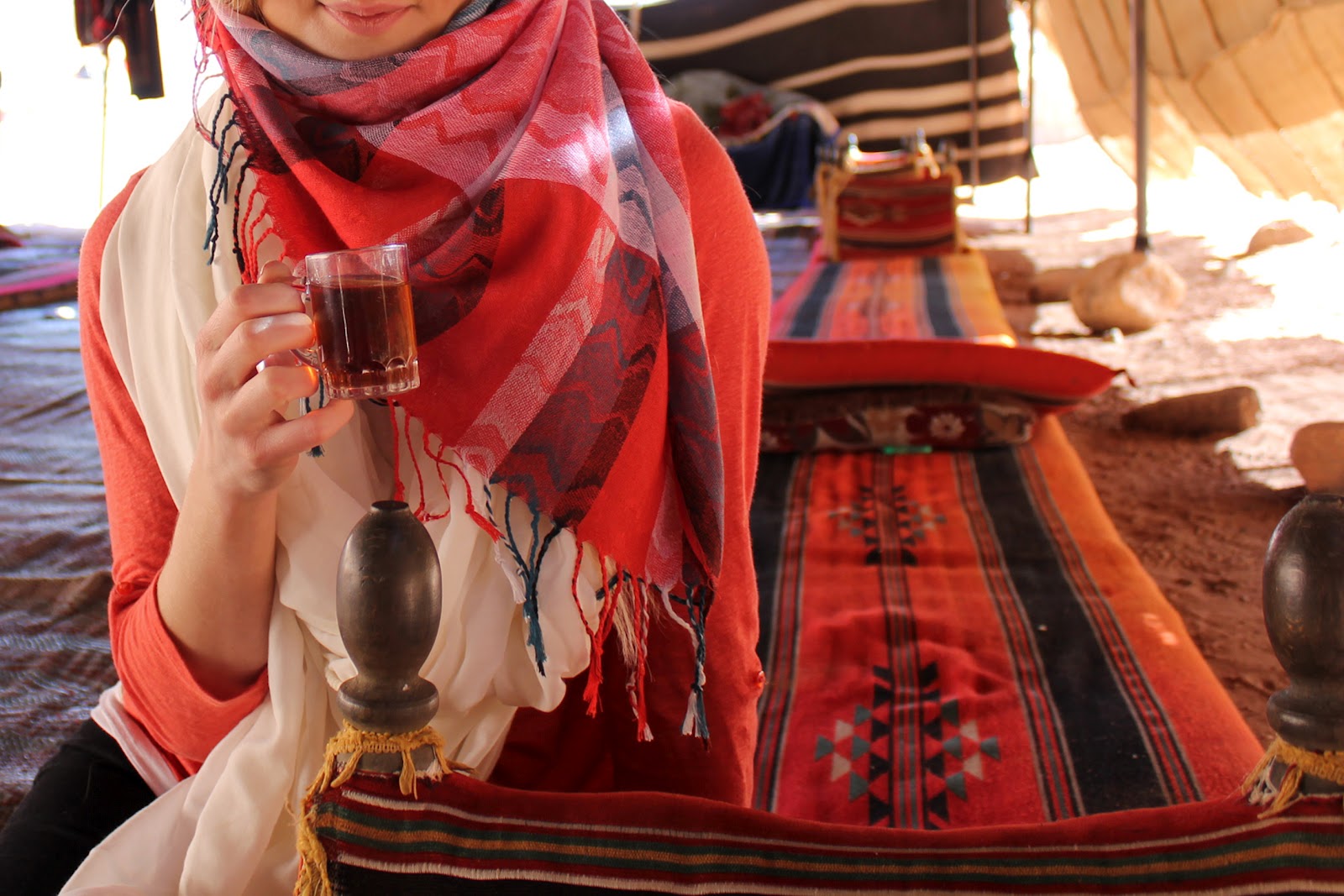 Jeeppi kurvasi pienen beduiiniteltan äärelle, tuttu huuto houkutteli sisälle ja arabiankieli kaikui kun beduiinit tarinoivat. Turisteille käännettiin vain murto osa ystävällisesti myhäillen. Hämärässä teltassa vieraille tehtiin tilaa tulen ääreltä ja höyryävät teekupit päätyivät käsiin kuin huomaamatta. Beduiinimiesten teehetkeä oli valloittava katsella, vaikka sanat jäivätkin vieraiksi, vangitsivat eleet ja tunnelma.